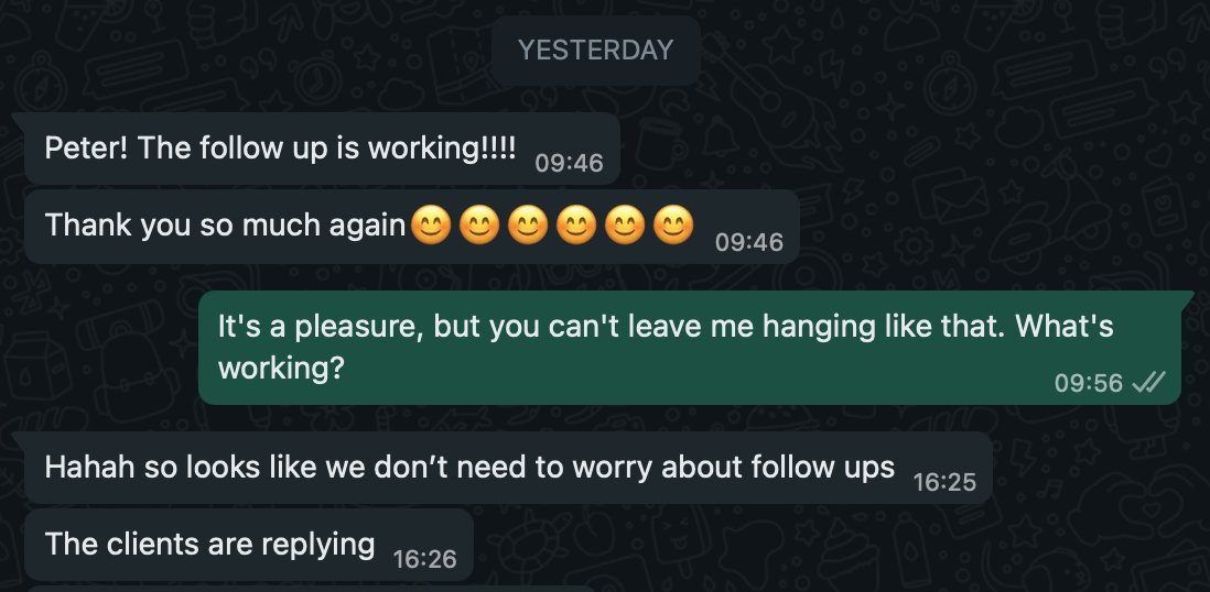 (If you can't see the picture, it's a screenshot of a WhatsApp conversation where my client says "Peter! The follow up is working" followed by lots of exclamation marks and six smiley faces.)