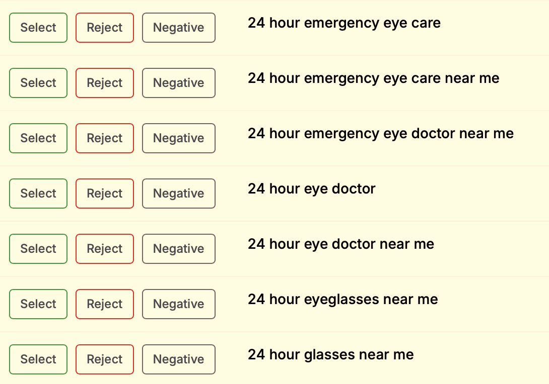 This takes a while, but it's a good investment in understanding the nuances of their business. (Screenshot of my keyword tool below. The buttons make it quick to select a keyword or add it to the negative list.)